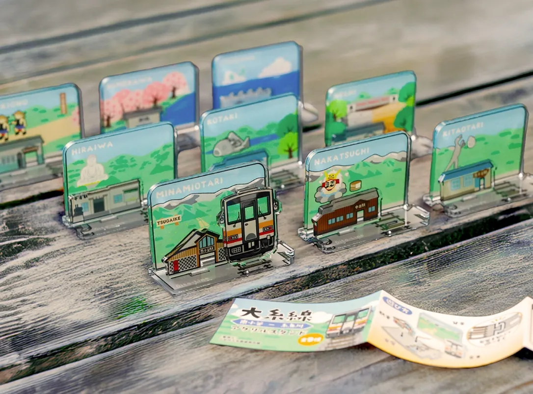 小谷村観光地域振興課観光商工係と協力して、JR大糸線の活性化を図るべくオリジナルアクリルスタンドをデザイン、生産いたしました。南小谷駅と糸魚川駅に現地でしか回せないカプセルトイを設置し、大糸線の利用客の増加を図る企画です。