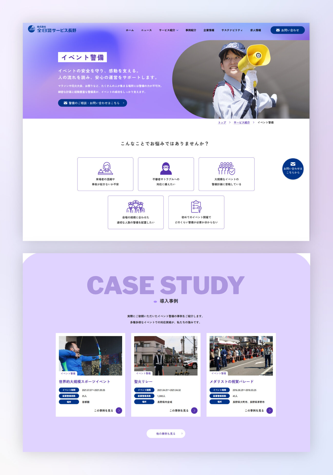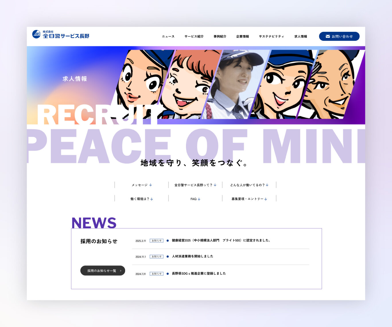 株式会社全日警サービス長野様のコーポレートサイトを制作させていただきました。株式会社全日警サービス長野様は、「警備業はサービス業である」という信念のもと、単なる安全確保にとどまらない、心に安らぎを届ける警備サービスを提供しています。長野県内最大規模の人員体制と確かな教育ノウハウを基盤に、交通・施設・イベント警備など地域に根ざした柔軟なサポートを実現。 「人の力」による温かみのあるセキュリティで、地域社会の平穏な日常と、そこで暮らす人々の「Peace of Mind(心の安らぎ)」を支えています。